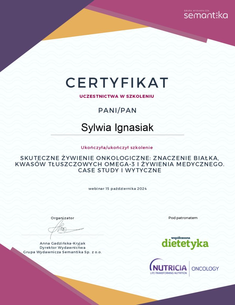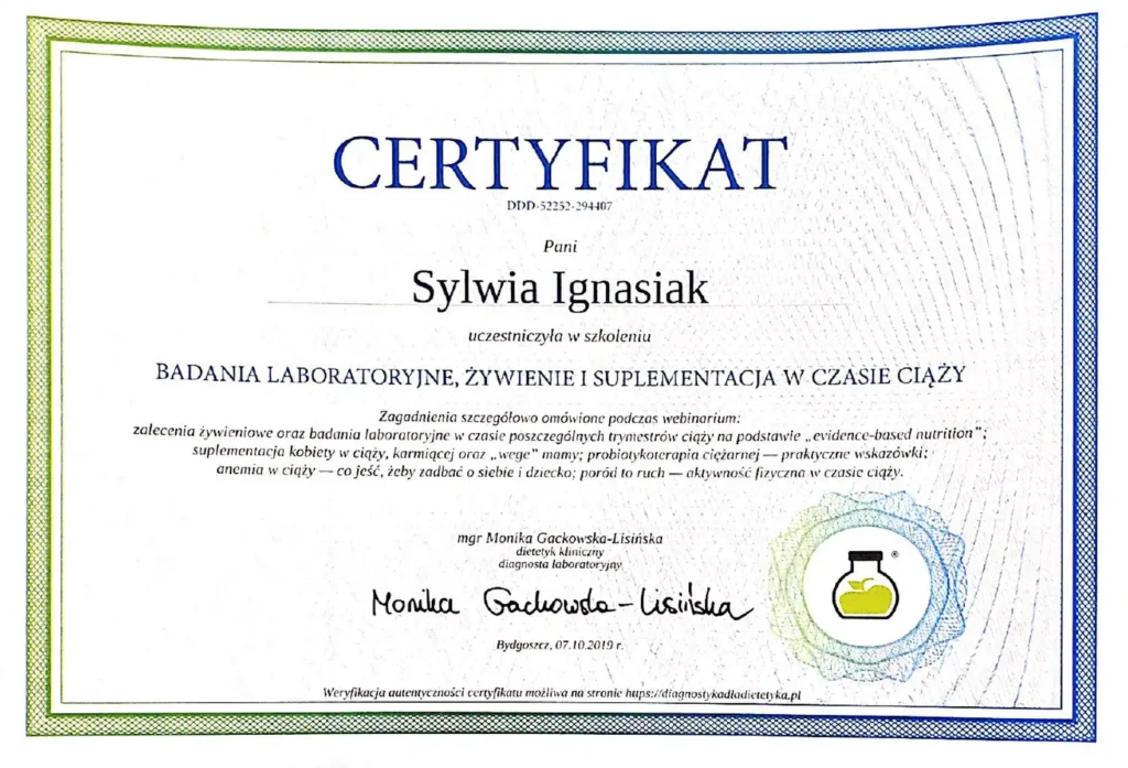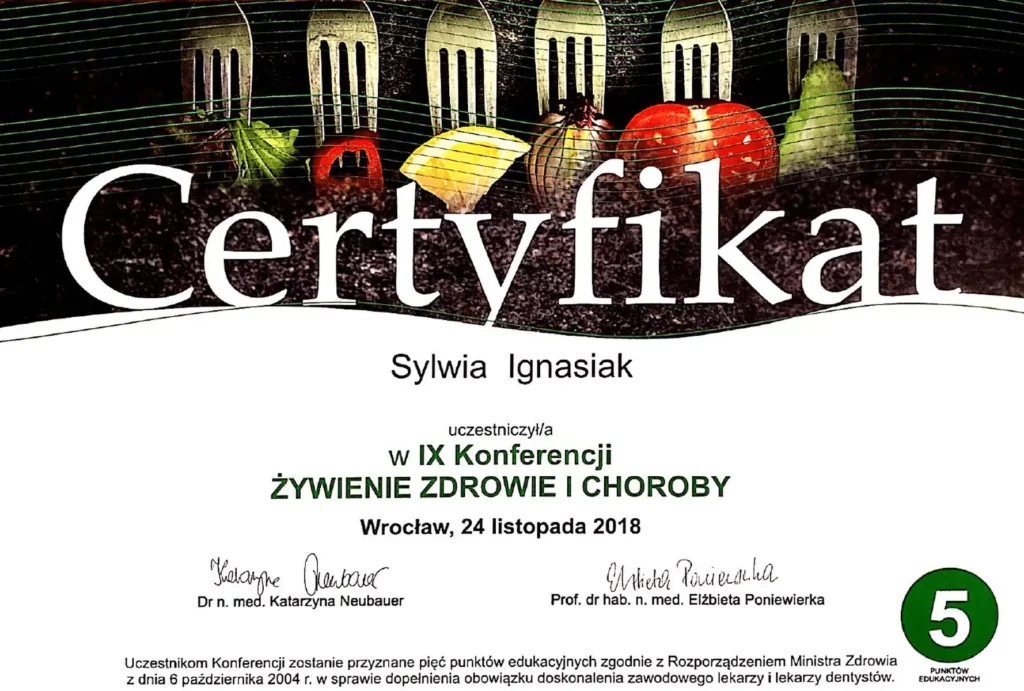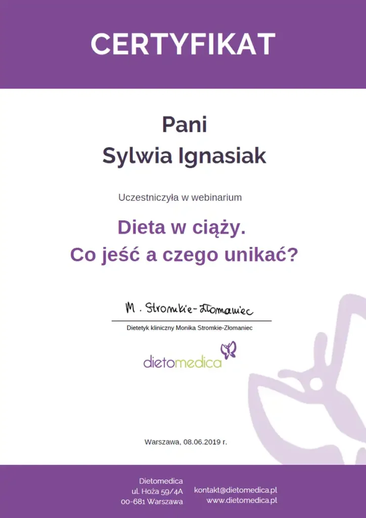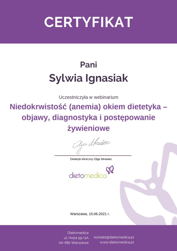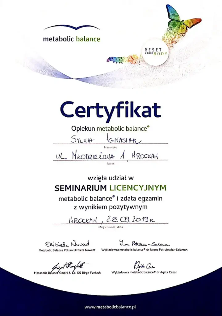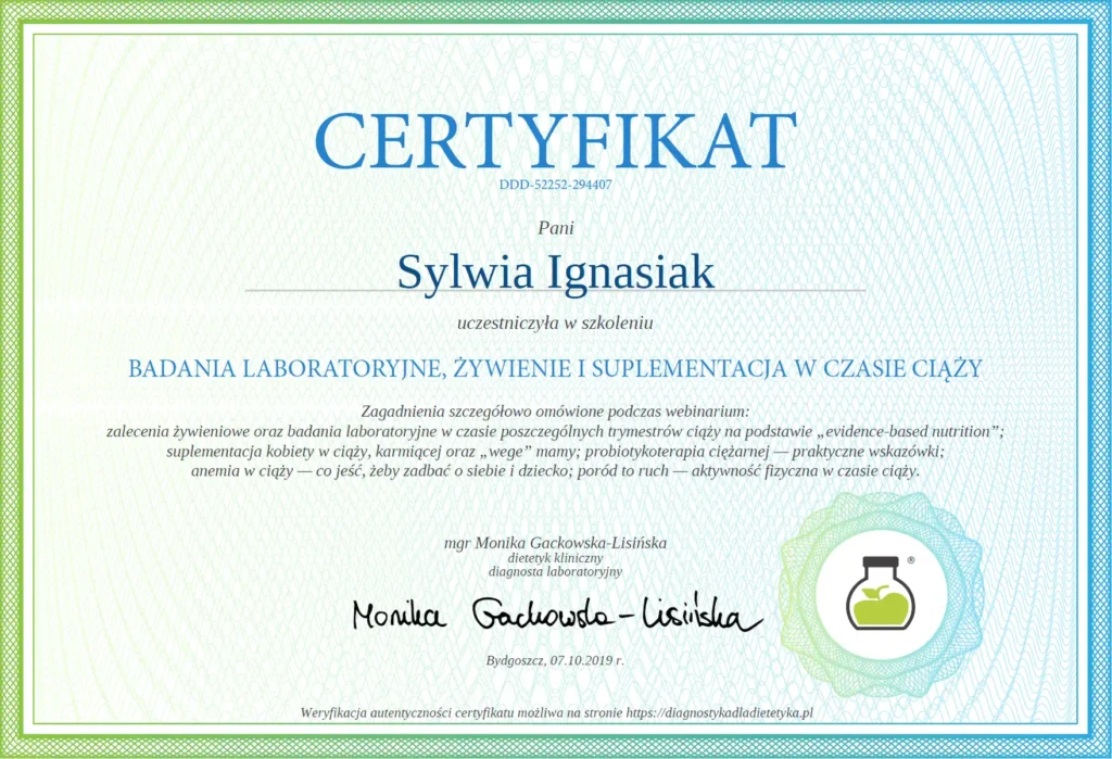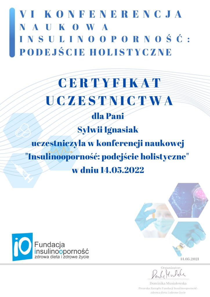 Z dumą prezentuję moje certyfikaty i kwalifikacje, które potwierdzają moją wiedzę i umiejętności w dziedzinie dietetyki. Każdy z nich jest wynikiem intensywnej pracy, nieustannego rozwoju oraz pasji do zdrowego odżywiania i wspierania innych w osiąganiu ich celów zdrowotnych.