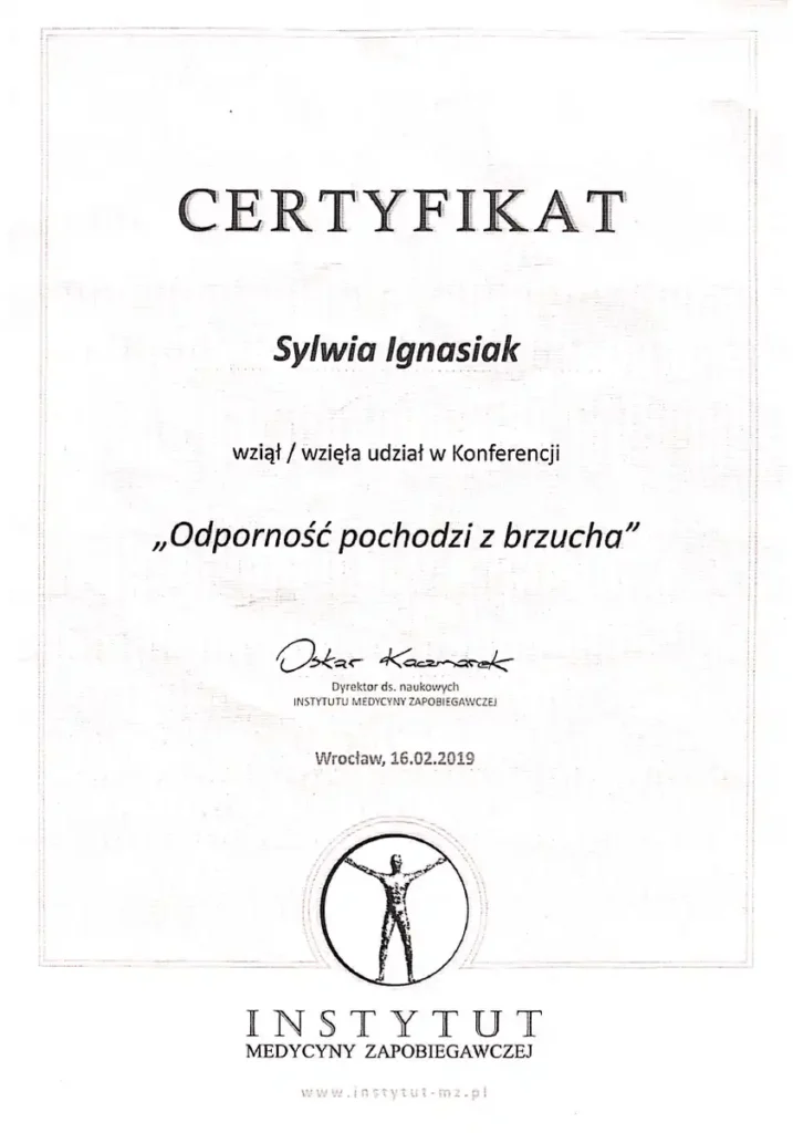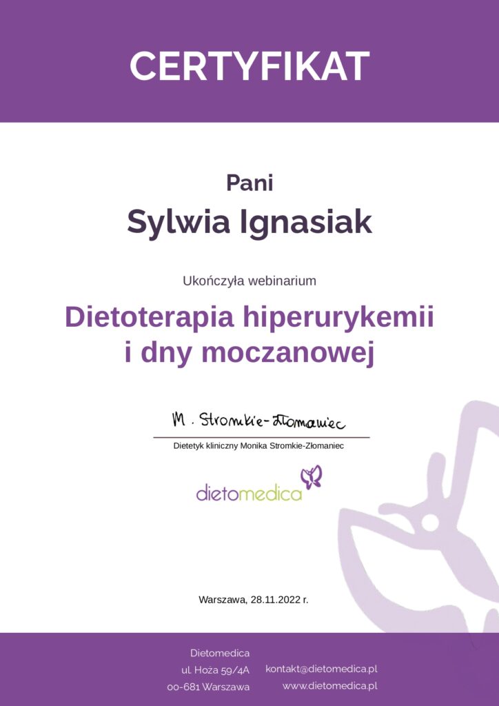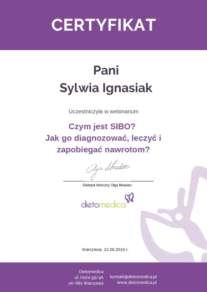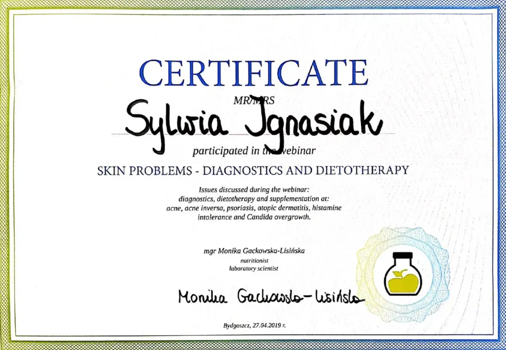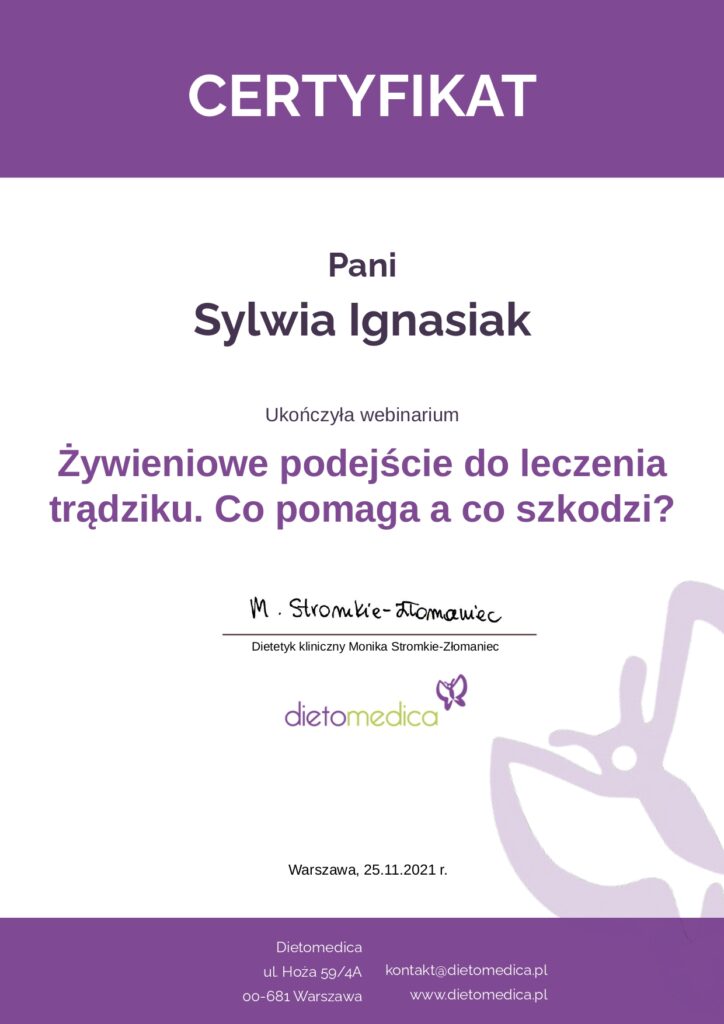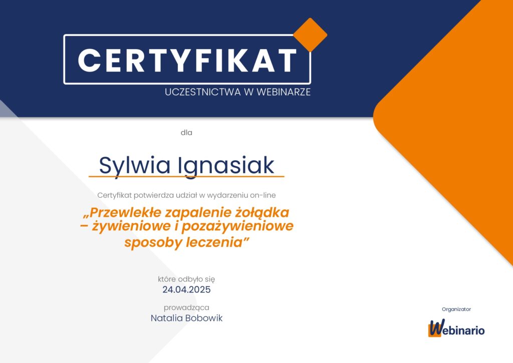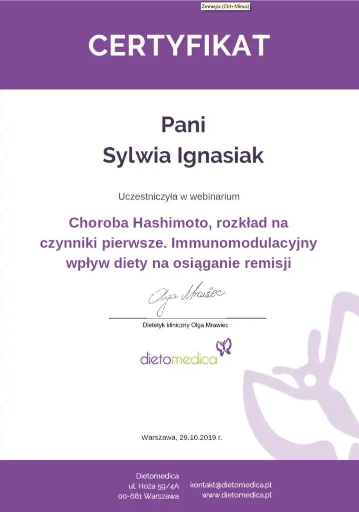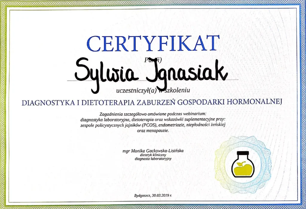 Z dumą prezentuję moje certyfikaty i kwalifikacje, które potwierdzają moją wiedzę i umiejętności w dziedzinie dietetyki. Każdy z nich jest wynikiem intensywnej pracy, nieustannego rozwoju oraz pasji do zdrowego odżywiania i wspierania innych w osiąganiu ich celów zdrowotnych.